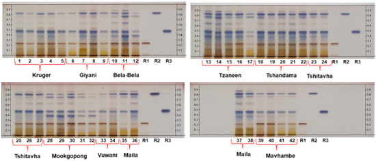 Dichloromethane: ethyl acetate: methanol: formic acid (90:10:30:1) and 10% sulfuric acid in methanol were identified as the most suitable mobile phase and derivatizing agent, respectively, for HPTLC fingerprinting of T. sericea, after repeatedly analysing randomly selected extracts using an assortment of developing solvents and applying a variety of derivatizing agents. The use of white light was found to be the most suitable for visualizing the compounds, as compared to ultraviolet radiation at 254 and 366 nm. The chemical variation within 42 root bark samples, collected from 10 different localities, was determined by carefully examining their HPTLC profiles. Images of the developed and derivatized plates obtained under white light are presented in Figure 1. Differences in the intensities of the bands representing the major compounds are evident within samples from different localities (for example, Kruger and Maila samples), as well as within samples from the same locality, for example Mookgophong samples P3 and P4 (Tracks 30 and 31). Inspection of the HPTLC plates revealed that resveratrol-3-O-β-rutinoside (R1), sericic acid (R2) and sericoside (R3) are major constituents of the root bark extracts, confirming previous reports [15,20]. Differences in their concentrations are evident from the different band intensities. Qualitative analysis of the major compounds indicated that samples from two localities, namely Tzaneen (Z1, Z2 and Z5) (Tracks 13, 14 and 17) and Maila (J1, J2 and J4) (Tracks 35, 36 and 38) contain the lowest concentrations of resveratrol-3-O-β-rutinoside, since the band intensities (brown band) are very low at the corresponding Rf value of 0.24. Faint bands representing low concentrations of sericic acid, a blue band at Rf 0.83, are visible in samples from Bela-Bela (B3) (Track 12), Vuwani (V1) (Track 33) and Mookgophong (P4 and P5) (Tracks 31–32). Sericoside, at Rf 0.48, can be observed in low concentrations in samples from Tzaneen (TZ) (Track 17), Bela-Bela (B3) (Track 12) and Mookgophong (P4 and P5) (Tracks 31–32).