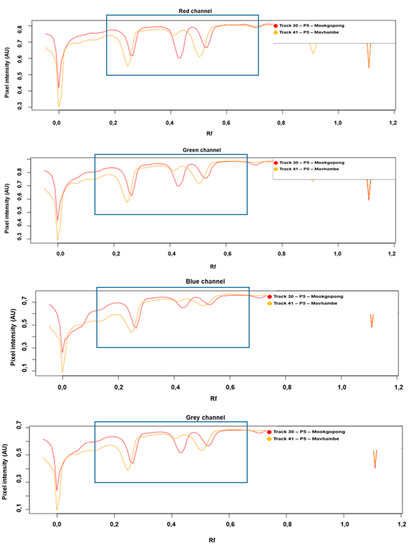 Plots of pixel intensity as a function of the Rf (retardation factor) value (densitograms), obtained from individual sample fingerprints using the rTLC software, are presented in Figure 2. Two samples, displaying very different band intensities, Mookgophong (Track 30) and Mavhambe (Track 41) (Figure 2), were selected to identify the channel that best reflects differences between the two samples, so that they can be clearly differentiated. A channel in this case represents a digital image represented by just one primary colour (Red, Green, Blue) or the grayscale (average) image. It was observed that for all of the channels, specific ranges contributed to the observed variations between the samples. All four channels (red, blue, green and grey) indicated differences in the compound intensities over the Rf range 0.2 to 0.7, as indicated by the blue rectangles (Figure 2).