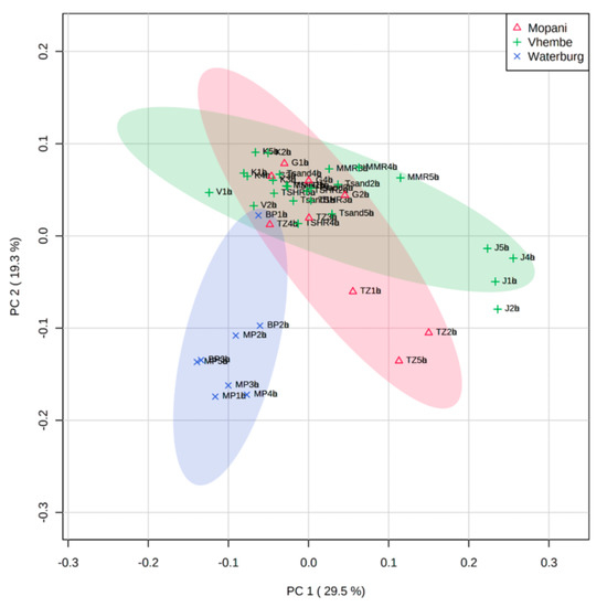 An eight-principal component PCA model was constructed using the fingerprints of the root bark samples from the three districts, to explore trends within the analytical dataset. A scores plot was constructed using the first and second components, accounting for 48.9% of the variation in the data. The scores plot was coloured according to the three districts (Figure 3). Generally, three main clusters can be observed that are related to the three districts. However, closer investigation of the three clusters indicate some extent of variation between and within districts. The Mopani (Red) cluster, encompassing samples collected from two localities (Giyani (G) and Tzaneen (TZ)), indicate that the chemistry of three TZ samples (TZ1, 2, 5) differs from that of other samples. Similarly, samples from Maila (J1–J4) are different from other Vhembe district samples (green). All samples from Waterberg district (blue), except BP1, cluster together and are separated from samples from the other districts. It can therefore be concluded that samples are not strictly clustered according to the district of origin, indicating differences within the chemistry of samples from the same district.