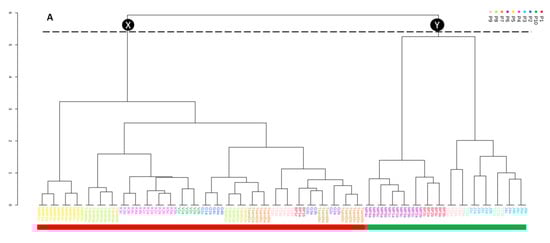 The inter- and intra-district variation in the chemistry that was observed encouraged further investigation of the ten populations (Tzaneen, Giyani, Maila, Tshitavha, Vuwani, Mavhambe, Tshandama, Kruger, Bela-Bela and Mookgophong) in an individual manner, to explore potential chemotypes based on localities. A dendrogram (Figure 4A) was constructed from the HCA to assess inter- and intrapopulation variation in the chemistry and to identify potential chemotypes based on locality. Two major branches, X and Y, can be observed on the dendrogram that are related to the separation along PC2 (Figure 3), with the X branch recording samples on the positive PC2, while the Y branch regroups samples on the negative PC2 (Figure 3). Branch X consists of samples from Kruger (K), Giyani (G), Vuwani (V), Tzaneen (TZ 3 and 4), Tshandama (TSA), Mavhambe (MMR), Bela-Bela (BP1) and Tshitavha (TSH), while Branch Y comprises samples from Mookgophong (MP), Bela-Bela (BP2 and 3) and Maila (J1–J4). Samples from Mavhambe (MMR), Kruger (K), Vuwani (V), Mookgophong (MP) and Bela-Bela (BP2 and 3) all cluster according to population. Notably, the clustering pattern is similar to the one obtained with the UPLC-MS data (Figure 4B). However, in the UPLC-MS data, samples J1–J4 and BP2 and 3 (Branch Y) were clustered separately from MP1-MP5 and TZ1, 2 and 5 (Branch X). From the HPTLC data, the separation of TZ3 and 4 from TZ1, 2 and 5 could be related to the differences in the band intensities (concentrations) of resveratrol-3-O-β-rutinoside, as previously indicated by the qualitative and quantitative data. This plausible explanation for the separation of the samples could not be deduced from the UPLC-MS data alone (Figure S1A,B), suggesting that HPTLC analysis is able to provide information that may be hidden when using liquid chromatography-mass spectrometry (LC-MS) for QC studies. The two branches defined by the dendrogram were used for class assignment: samples on Branch X were assigned to Chemotype 1 and samples on Branch Y to Chemotype 2. The scores plot was later coloured according to the two chemotypes (Figure 4C). The constructed loadings plot (Figure 4D) indicates some of the Rfs that contribute to the clustering observed on the dendrogram. Taking into account that the rTLC software calculates the horizontal mean for each pixel of the chromatogram, the major compounds of T. sericea (resveratrol-3-O-β-rutinoside, sericic acid and sericoside) were indicated within a range of Rf values. Therefore, the brownish resveratrol-3-O-β-rutinoside band is defined by the Rf range 0.166–0.235; the blue-ish band representing sericic acid is defined by the Rf range 0.815–0.865, and the blue band sericoside appears within the Rf range 0.431–0.52. Considering the ranges indicated for each of the three major compounds, the loadings plot revealed that sericic acid and sericoside contributed to the clustering (Figure 4A). This trend was similar to the observation of the previously published UPLC-MS data [20] (Figure S1B).