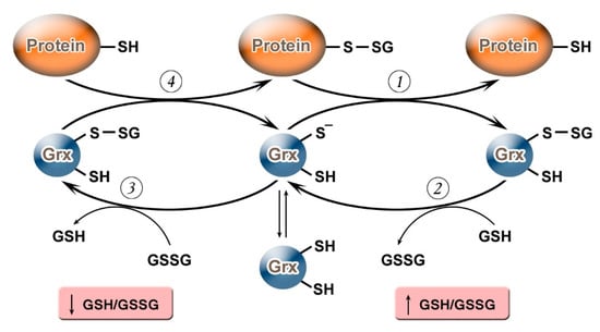 S-glutathionylation is a reversible post-translational modification and, as a rule, deglutathionylation proceeds with the participation of enzymes and is more carefully regulated, in comparison with S-glutathionylation. Glutaredoxin (Grx) is one of the most effective and well-studied enzymes, which reduces Pr-SSG. In the traditional classification, they are divided into mono- and dithiol Grx, depending on whether one or two cysteine residues, respectively, are in the active center. The role of dithiol Grxs is mainly considered in the regulation of reversible S-glutathionylation [26,43,44].