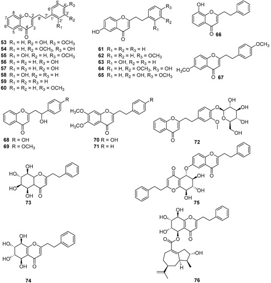 - Li, W.; Cai, C.H.; Dong, W.H.; Guo, Z.K.; Wang, H.; Mei, W.L.; Dai, H.F. 2-(2-Phenylethyl)chromone derivatives from Chinese agarwood induced by artificial holing. Fitoterapia 2014, 98, 117–123. [Google Scholar] [CrossRef]