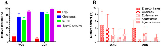 The chemical distribution in wild harvested “Qi-Nan” (WQN) agarwood and cultivated “Qi-Nan” (CQN) agarwood (Sesquiterpenoids: Sqtp). The relative contents of chromones and sesquiterpenoids in the WQN and CQN agarwood (A). The relative contents of five predominant types of sesquiterpenes in the WQN and CQN agarwood (B).
