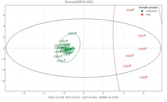 The compound information of CQN and WQN agarwood was introduced to the orthogonal partial least-squares (OPLS) statistical analysis, except for WQN7 which was formed in the bark, while the other samples were obtained in the xylem. The quality of the model was evaluated by R2X, R2Y and Q2Y. The R2X/R2Y value represents the percentage of predictor/response variance explained. The Q2Y refers to the predictive ability of the model which is calculated by cross-validation, and the RMSE represents the prediction accuracy of the model. As shown in Figure 4, The relatively low R2X value may be attributed to the scattered compound distribution of the WQN agarwood. Meanwhile, the compound distribution of CQN agarwood is centralized. This indicated that the quality uniformity of CQN agarwood is better than the WQN agarwood varieties, which were purchased from a wide range of geographical areas.