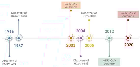 HCoV-229E (alpha-HCoV) and HCoV-OC43 (beta-HCoV) were identified in the mid-60s, as two of the strains causing the common cold [,,]. The presence of non-typical respiratory viral strains was suspected since 1962, yet difficulties in cultivating viruses impeded scientists from discovering those strains earlier []. Van der Hoek, reviews the discovery and clinical manifestations of those “old HCoVs” []. Replication of both strains in the human body produces similar symptoms, such as excess nasal excretions, light cough, malaise and rarely, fever. Nevertheless, those strains were proven serologically unrelated, as antibodies isolated from OC43-infected persons, were unable to neutralize 229E. Lower respiratory tract infection was found more common in children and the elderly, manifested with bronchitis, bronchiolitis, croup, and pneumonia, while healthy adults presented mainly common cold. The prevalence of old CoVs infection in the general population has been studied in several cases, although difficult because of the varying clinical manifestations. Reverse-transcription PCR (RT-PCR) has been used for the identification of HCoV viral strains, in one of the largest studies among the UK population, revealing the autumn-winter seasonality of OC43, the lack of seasonality for 229E and its high detection in immunocompromised patients []. There are several indications that viral infection from 229E reprograms the host cell transcriptome with a subsequent fine-tuning of NF-κΒ, in order to ensure optimal replication [].