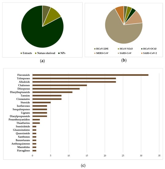 Before the emergence of SARS-CoV and MERS-CoV, the investigation of NPs as anti-HCoV agents was limited to only a few studies. The two epidemics have spurred however the interest in the discovery of anti-HCoV agents, including the investigation of agents active against the “common cold” HCoVs, 229E, NL63, OC43 and HKU1. Screening chemical libraries against target proteins and/or viral replication in cell-based assays have been extensively employed, resulting in the discovery of several antiviral natural products/small molecules (NPs/SMs) [,,,]. It was found that NPs/SMs are a rich source of drug potential leads against coronaviruses due to their pronounced structural diversity and complexity. Several compilations of pre-2020 findings on NPs/SMs with activity against coronaviruses were recently reported, some of which could serve as leads for the development of new drugs [,,,,,,,,,,,]. Among the identified molecules the majority is represented by NPs (Figure 2a) and most of them have been found as inhibitors of SARS-CoV (Figure 2b). Among them, the most numerous classes are flavonoids, triterpenes and alkaloids (Figure 2c), which is not surprising since in these classes reside the greatest number of NPs described as endowed with inhibitory activity against replication of multiple different viruses. In addition, flavonoids are a class of NPs present in almost every plant species and are strongly represented in various NP-based chemical libraries available for screening.