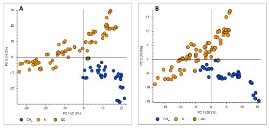 PCA score plots of MS data in the positive (A) and negative (B) ion modes constructed in the Compound Discoverer software using Pareto scaling for Chinese (CH, blue points) and Greek (K, orange points) propolis samples. QCs (green points) are tightly clustered close in both ion modes.