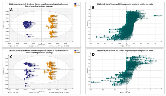 In continuation of our research on propolis [,] and following early findings on geographical differentiation, untargeted LC-MS metabolomics analysis was employed for chemical composition comparison of Greek and Chinese propolis extracts. Applying PCA, two groups were straightforwardly separated, Greek and Chinese samples, both in the positive and the negative ion modes. The clear separation of clusters in the unsupervised PCA model suggest phytochemical differences between the samples harvested from Greece and China. In addition, supervised models PLS-DA and OPLS-DA were also applied, showing statistically significant separation between the two groups.