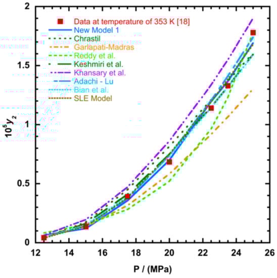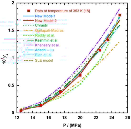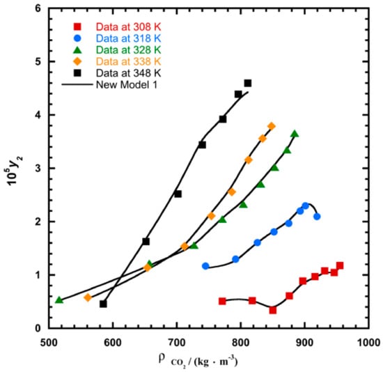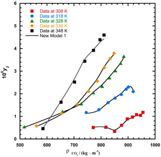 Bian et al. (2016) [14] found a model with five constant parameters with relationship between solubility of solute ( and density, , and obtained the following model: