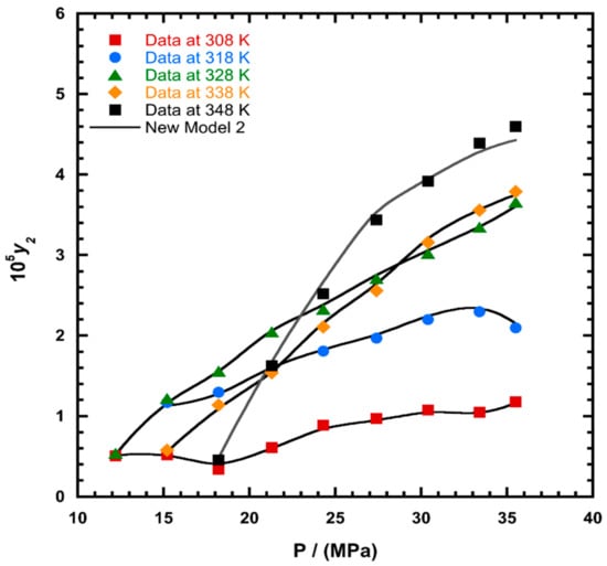 Plot of mole fraction (y2) as a function of pressure (P/MPa) for 1-amino-2,3-dimethyl-9,10-anthraquinone, the solid line represents the proposed model 2 (Equation (21)).