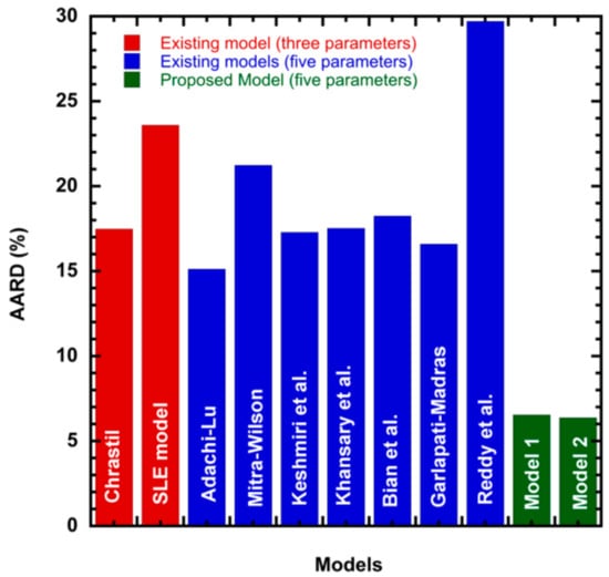In this study, we propose two new solid–liquid equilibrium criteria models to correlate solubility of solid in supercritical carbon dioxide. The accuracy of the proposed models is evaluated by correlating 25 anthraquinone derivative compounds available in the literature. The correlating ability of the new models are evaluated in terms of: AARD, R2, Adj. R2, SSE, and RMSE. There are more than 25 models available in literature [29] for correlating solubility of solids in supercritical fluids. However, for comparison purposes, we have considered Chrastil model, Adachi and Lu model, Mitra—Wilson model, Keshmiri et al. model, Khansary et al. model, Garlapati and Madras model, Reddy et al., model, and one existing three parameters solid–liquid equilibrium model. These are grouped as three parameter models and five parameter models. Table 2 shows the information of the 25 anthraquinone derivatives considered in this study. Table 2 shows the solubility range and references [4,16,17,18,32,33,34,35,36,37,38] from which the data are obtained. Table 1 shows the physical properties such as melting point, melting enthalpy, and molar volume of the solutes. For some compounds, these properties are not available and for such compounds we have used the Jain et al. method [20] and Fedors method [21] for evaluating the melting enthalpy and solute molar volumes, respectively. The constant parameters of literature models considered, Chrastil, Adachi-Lu, Mitra—Wilson, Keshmiri et al., Khansary et al., Bian et al., Garlapati—Madras, and Reddy et al., are listed in the Supplementary Materials (Tables S1–S8). Table 3 shows the correlation results of the three parameter solid–liquid equilibrium model. Table 4 shows the correlation constants of the new model 1. Table 5 shows the correlation constants of the new model 2. Table 6 shows the overall mean statistical parameters of various solubility models. From Table 6, it is clear that the proposed models show the lowest AARD. The new model 1 shows an overall AARD% of 6.538 and the second model (new model 2) shows an overall AARD% of 6.377. The two models proposed in this work are observed to perform the correlation on a par. Although they look different in functional form, their correlation ability is matching well. This correlating matching ability may be attributed to its oneness in their functional form.
