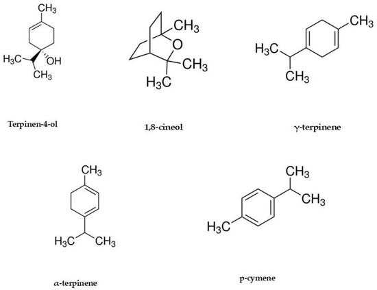 TTO was found to be rich in terpinen-4-ol (35.88%) and γ-terpinene (19.65%), followed by a low percentage of α-terpinene (8.64%), p-cymene (4.61%), and 1,8-cineol (4.07%), in accordance with data from the ISO 4730:2017, as previously reported [11].