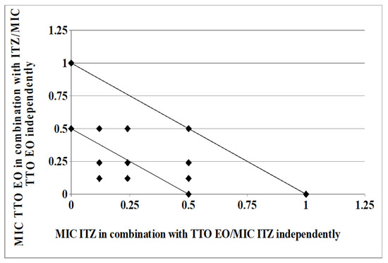Moreover, TTO significantly potentiated the effect of azoles in combination therapy, reducing the MIC of both of them up to 8-fold: ITZ from 0.5 to 0.06 µg/mL and KTZ from 0.25 to 0.03 µg/mL. In addition, for each one of these interactions, the MIC for TTO (MICc) was below the testing concentration (MICa) (0.135/0.27 mg/mL vs. 1.08 mg/mL): it was remarkably decreased in the mixture with ITZ compared to the KTZ combination (8-fold vs. 4-fold).
