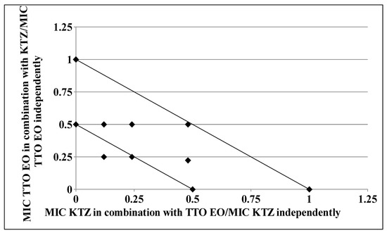 Isobologram of a synergistic interaction between TTO and KTZ against Trichophyton rubrum SL 171/13 strain. KTZ–FIC data are drafted on the x-axis, while TTO–FIC values are drafted on the y-axis.