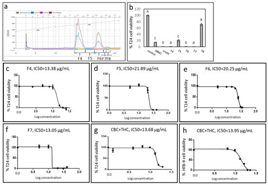 (a) Flash chromatography profile of C. sativa IGB strain crude extract. Fractions were collected and designated F4-F8. (b) Cell viability of T24 cells treated with different fractions of C. sativa IGB strain extract and fractions. Cell viability was determined by XTT assay as a function of live cell number. Cells were treated with the crude extract and fractions F4, F5, F6, F7 and F8 at a concentration of 30 μg/mL for 48 h. Mitomycin-C (MMC, 8 µg/mL) served as a positive control. Methanol (control) treatment served as a solvent (vehicle) control. Error bars indicate ± SE (n = 3). Levels with different letters are significantly different from all combinations of pairs by Tukey–Kramer honest significant difference (HSD; p ≤ 0.05). (c–g) Dose-effect curves of the crude extract, fractions F4, F5, F6, F7 and CBC + THC on the viability of the T24 cell line. (h) Dose-effect curves of crude extract of CBC + THC on the viability of HTB-9 cell line. Data points were connected by non-linear regression lines of the sigmoidal dose-response relation. GraphPad Prism was used to produce the dose-response curve and IC50 doses.