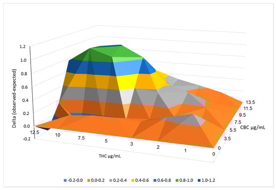 Synergistic interactions between CBC and THC on cell viability of T24 cells following combined treatments. Synergy of cytotoxic activity calculated using the Bliss independence drug interaction model. Synergy is apparent when the experimental (observed) value of cell death is higher than the calculated (expected) value. Delta between the observed and expected values, calculated using the Bliss model are shown in the Y axis.