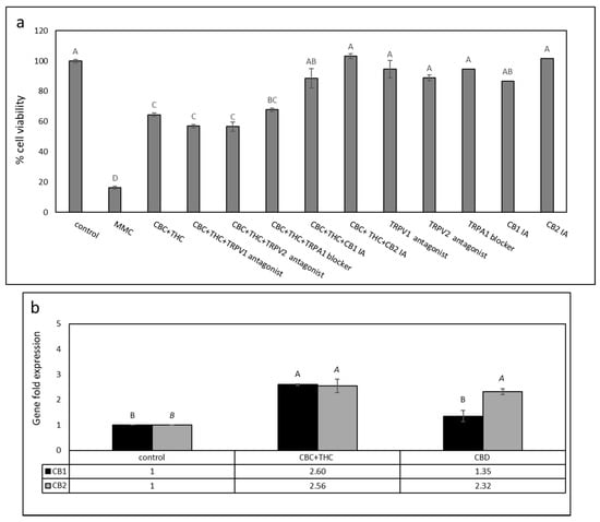 (a) Cell viability of T24 cells treated with CBC+THC (11.5 + 2.0 μg/mL, respectively) with or without CB1, CB2 inverse agonists (IA), TRPV1 or TRPV2 antagonists, or a TRPA1 blocker (10 µM). Cell viability was determined by XTT assay. Mitomycin-C (MMC, 8 µg/mL) served as a positive control. Methanol (control) treatment served as a solvent (vehicle) control. Error bars indicate ± SE (n = 3). Levels with different letters of the same font are significantly different from all combinations of pairs according to the Tukey–Kramer honest significant difference (HSD). (b) Quantitative PCR determination of the RNA steady state level in T24 cell line of CB1 receptor (CNR1) or CB2 receptor (CNR2) genes, after treatment with CBC + THC (11.2 + 1.8 μg/mL, respectively) or CBD (9.2 μg/mL) for 6 h relative to control. Methanol (control) treatment served as a solvent (vehicle) control. Gene transcript values were determined by quantitative PCR as a ratio between the target gene versus a reference gene (HPRT1; geneID 3251). Values were calculated relative to the average expression of target genes in treated versus control using the 2ΔΔCt method.