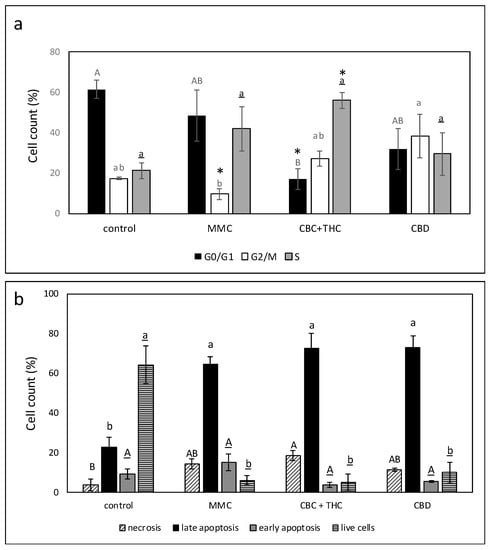 (a) Determination of the stages of cell cycle arrest following treatment with CBC + THC (17.2 + 2.8 μg/mL, respectively) or CBD (15 μg/mL) on the T24 cell line for 24 h. Mitomycin-C (MMC, 8 µg/mL) served as a positive control. Methanol (control) treatment served as a solvent (vehicle) control. Error bars indicate ± SE (n = 3). Levels with different letters of the same font are significantly different from all combinations of pairs according to Tukey–Kramer honest significant difference (HSD; p ≤ 0.05). * indicates significantly different mean from the control based on Student t-test (p ≤ 0.05). (b) Proportion of viable, apoptotic, or necrotic cells following treatment with CBC+THC (17.2 + 2.8 μg/mL, respectively) or CBD (15 μg/mL) on T24 cell line for 48 h. Mitomycin-C (MMC, 8 µg/mL) served as a positive control. Methanol (control) treatment served as solvent (vehicle) control. Error bars indicate ± SE (n = 3 for treatments, n = 4 for the control). Levels with different letters are significantly different from all combinations of pairs according to Tukey-Kramer honest significant difference (HSD; p ≤ 0.05).