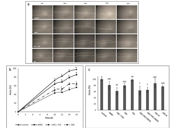 (a) Examples of pictures taken for estimation of the treatment effect of CBC + THC (8.6 + 1.4 µg/mL respectively), CBD (10 µg/mL) or Mitomycin-C (MMC, 4 µg/mL) on recovered area of confluent monolayers of T24 cell line at 0, 10, 12, 14 and 16 h. Methanol (control) treatment served as solvent (vehicle) control. (b) The effect of treatment with CBC + THC (8.6 + 1.4 µg/mL respectively) or CBD (10 µg/mL) on the recovered area of confluent monolayers of the T24 cell line. (c) The effect of treatment with CBC+THC (8.6 + 1.4 µg/mL respectively), CBC (10 μg/mL), THC (10 µg/mL) or CBC+THC (8.6 + 1.4 µg/mL respectively) with CB1 or CB2 IA (10 µM) on the recovered area of confluent monolayers of the T24 cell line at 14 h. Mitomycin-C (MMC, 4 µg/mL) served as a positive control. Methanol (control) treatment served as solvent (vehicle) control. Values are means ± SE (n = 12). Values with different letters of the same font are significantly different from all combinations of pairs according to Tukey–Kramer honest significant difference (HSD; p ≤ 0.05).