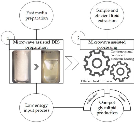 In this work, we demonstrated a proof of concept of the lipid extraction from oleaginous biomass and the subsequent glycolipids formation using lipase-catalyzed reaction with microwave-assisted processing in acidified DES. The medium made of choline chloride and sugar alcohols was prepared, among other more common DESs, in a matter of seconds using microwave technology, highlighting a technological match. In such “2-in-1” system, any combination of sugars and lipids is virtually possible to prepare tailor-made glycolipids. Indeed, other oleaginous biomasses for the synthesis of glycolipids could be considered. With the help of the developed robust reaction system combined with a proper identification strategy, compounds were isolated and characterized. In addition, screening for potential bioactivity of the DES containing mixtures or isolated compounds would be an interesting follow-up.