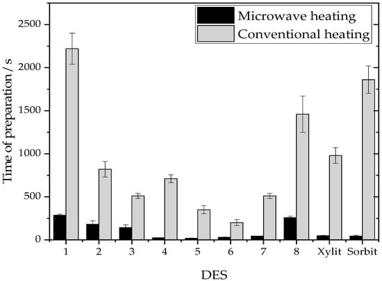 Preparation times of common and sugar-alcohol DESs with microwave heating and thermal heating, mean standard deviation indicates significant differences (p < 0.05).