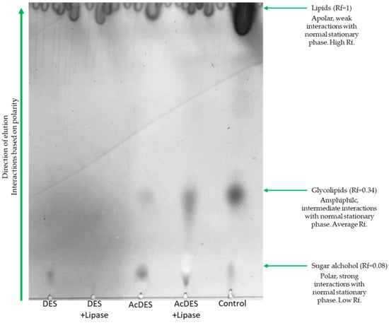 The TLC of Sorbit DES was presented in Figure 3. Similar profiles were obtained regardless of the DES. With a standard DES, with or without lipase, only a single spot could be identified (Rf = 0.08), corresponding to the sugar alcohol. In contrast, two spots with (Rf = 0.08 and 0.34) were found in an acidified DES without lipase. In the acidified DES with lipase, the same profile was obtained, but with higher intensity of the stain corresponding to the glycolipid (Rf = 0.34). A control reaction with an acidified DES with lipase, and fatty acid methyl esters (FAMEs) from single cell oil extraction, was performed for confirmation.