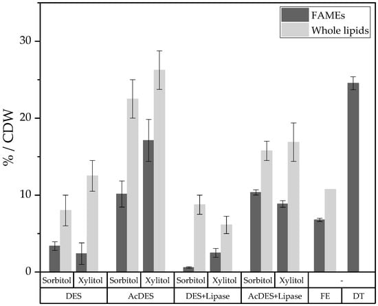 The FAMEs and whole lipids obtained per CDW are shown in Figure 4. A comparison of the different lipid extraction methods showed that direct transesterification of the oleaginous biomass to fatty acid methyl esters gave the highest FAMEs yield per CDW. Extraction according to Folch was less efficient in regard of the FAMEs and whole lipids contents. In comparison to DT, acidified Xylit DES extracted up to an honorable 70% FAMEs from robust yeast cells of S. podzolica. Intrinsically, our DESs were not the best extraction method reported however, the subsequent interesterification of those lipids for sugar alcohol ester production made the use of these unconventional media relevant.