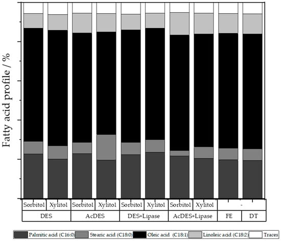 Lipid profiles were determined for each condition to assess if the fatty acid composition is influenced by the extraction method (Figure 5). When comparing the various fatty acid extraction methods, no significant differences in fatty acid profile were observed. In percentage terms, oleic acid (C18:1) with an average of 24.2% is the most common of all extraction methods, followed by palmitic acid (C16:0) with 9.0%, linoleic acid (C18:2) with 4.1%, and stearic acid (C18:0) with 2.8%.