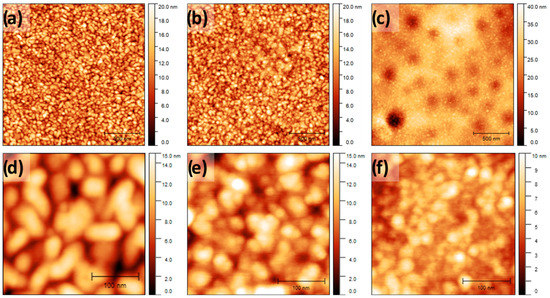 Atomic force microscopy (AFM) topographic images of 2 µm × 2 µm (a–c) and 0.6 µm × 0.6 µm (d–f) for bare polycrystalline gold substrate (a,d), monolayer of micelles (b,e) and multilayer of micelles (c,f).