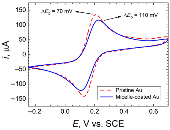 A comparative analysis of the electrochemical behavior of the micelle-coated gold surface and the pristine electrode was performed by considering simple one-electron transfer reactions involving a change in the oxidation state of iron, namely hexacyanoferrate(III), [Fe(CN)6]3−, and ferrocenemethanol, FcMeOH, in 0.1 M KCl solution. The iron complexes were chosen as to consider both an outer-sphere redox system, FcMeOH1+/0, and an inner-sphere redox pair, [Fe(CN)6]3−/4−. Measurements were initiated after 60 min immersion in the solution to attain their corresponding open circuit potentials: +0.165 and +0.090 V vs. SCE, respectively. No significant potential differences (namely, less than 3 mV) were observed within the OCP values displayed by the pristine and the modified gold surfaces for each given redox mediator system.