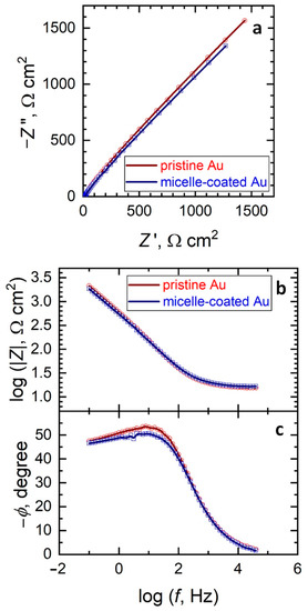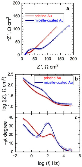 (a) Nyquist and (b,c) Bode diagrams of the impedance spectra of pristine and micelle-modified gold in 0.1 M KCl + 1 mM ferrocenemethanol. The solid lines and the discrete points correspond to the fitted and the measured data, respectively.