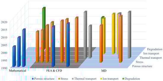 Molecular dynamics (MD) simulations have been applied to understand the properties at the molecular-level and design chemical structures with high performance. There are variations of MD simulation models utilizing different chemical force-field based on their characterizing phenomena, for instance, pyrolysis [24], nucleation [25], material thermal/electrical properties [26], and so on. Moreover, MD simulations are used to predict the chemical interactions between different materials and understand numerous membrane properties. Table 2 summarized the numerical studies associated with separators, which are applied with numerical simulations, including mathematical models, FEA and CFD simulations, MD simulations, and so on.
