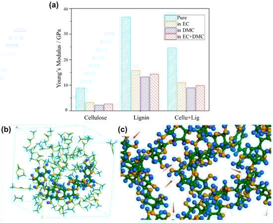 Simulation results from Xie et al. [47] (a) simulated Young’s modulus of molecular models under different environments, and distinct details in blended models: (b) deformed cellulose amorphous model in electrolyte solvents and (c) generated hydrogen bonds between cellulose and lignin molecules.
