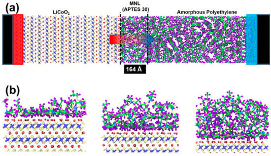 Representative images of the molecular assembly from Dhakane et al. [48]. (a) Molecular structure for simulation of a case with a bridging molecular layer (30 APTES molecules) at the LiCoO2-polyethylene interface. Hot reservoir (red rectangle on the left) and cold reservoir (blue rectangle on the right) maintained at 350 K and 250 K respectively are shown. (b) Schematics of the cathode-APTES interface for simulations with 10, 20, and 30 molecules.
