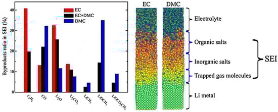 Kim et al. [41] studied the formation and growth of SEI for the case of ethylene carbonate (EC), DMC, and mixtures of these electrolytes using molecular dynamics simulations. The simulation studied the distribution of organic and inorganic salts as a function of the distance from the anode surface in Figure 8, and the results show that inorganic salts are found closer to the anode surface while the region near the electrolyte–SEI interface is rich in organic salts.