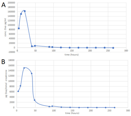 The excretion amount of OXA and its main metabolite in urine were normalized to creatinine concentration. Creatinine analysis of the urine samples, based on the enzymatic procedure using a Dimension Vista 1500 system (Siemens Healthcare, Erlangen, Germany), was performed by the clinical laboratory SK-Lab (Lucenec, Slovakia). The principle of the enzymatic method is a reaction of peroxide with a chromogen in the presence of peroxidase enzyme to obtain a colored end product which is measured at 540 and 700 nm. The peroxide is created from creatinine which is hydrolyzed by creatininase and creatinase to sarcosine. Sarcosine oxidase hydrolyzes sarcosine to glycine, formaldehyde, and peroxide. The amount of peroxide is proportional to the concentration of creatinine in the sample. The analytical measurement range of the creatinine in the urine matrix was from 250 to 35,400 μM. The urine samples were measured directly from the specimen without any pretreatment (except dilution).