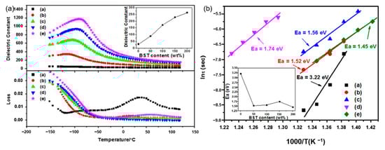 (a). Temperature dependence of permittivity and dissipation factor of (a) G-0 (b) G-50 (c) G-100 (d) G-150 and (e) G-200 (measured at 1 MHz). Inset: permittivity at room temperature of the samples. (b). Weibull plots of dielectric breakdown strength of (a) G-0 (b) G-50 (c) G-100 (d) G-150 and (e) G-200 (Ea: average dielectric breakdown strength). Inset: Ea of the samples. Reprinted with permission from [9]. Copyright 2013 Elsevier Ltd. and Techna Group S.r.l.