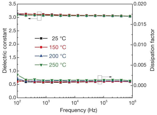 Frequency dependence of the permittivity and dissipation factor of c-BCB/BNNS with 10 vol% of BNNSs at different temperatures. Error bars show standard deviation. Reprinted with permission from [12]. Copyright 2015, Springer Nature.