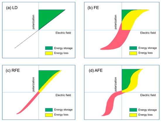 Hysteresis and corresponding energy storage density for (a) linear dielectrics, (b) ferroelectrics, (c) relaxor ferroelectrics and (d) antiferroelectrics. The green area represents energy density and the red area refers to the energy loss.