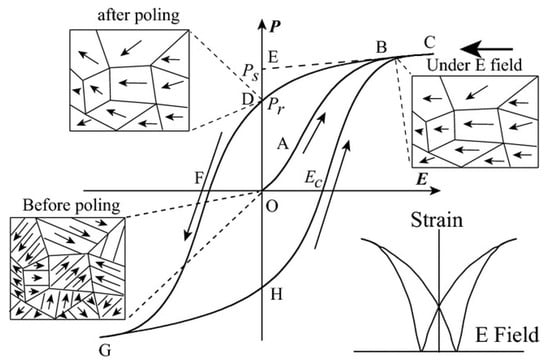 A typical hysteresis loop in ferroelectrics and strain-electric field curve. Reprinted with permission from [24]. Copyright 2013 The American Ceramic Society.
