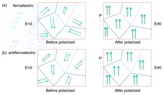 Figure 8 compares the internal polarization processes of ferroelectric materials and antiferroelectric ones. In ferroelectric materials, adjacent dipoles within the same domain have the same polarization direction. The polarization direction is opposite in antiferroelectrics (Figure 8a), only when a sufficiently large electric field is applied and the dipoles can be realigned similar to the ferroelectric.
