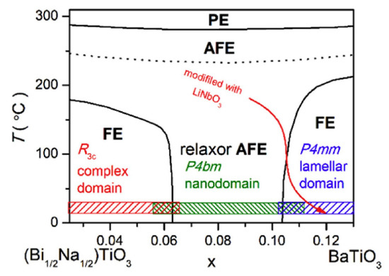Phase diagram of the (1 − x)(Bi1/2Na1/2)TiO3-xBaTiO3 ceramics. PE, AFE and FE represent paraelectric, antiferroelectric and ferroelectric phase, respectively. Reprinted with permission from [54]. Copyright 2019 Elsevier Ltd. and Techna Group S.r.l.