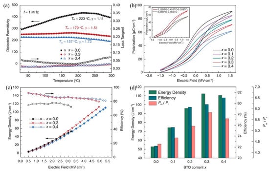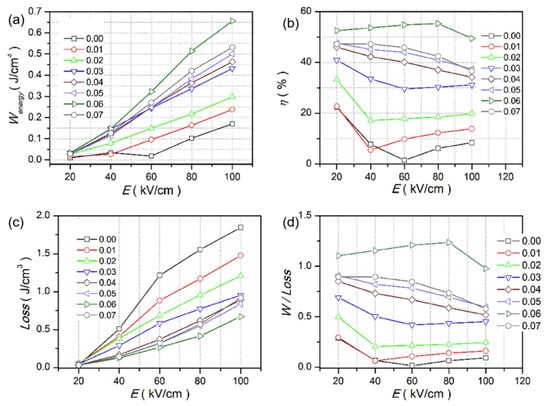 Wenergy, Wloss, η and Wenergy/Wloss of (1 − x)(BNT-12BT)-xLiNbO3 at selected electric fields. (a) Wenergy, (b) η, (c) Wloss (d) Wenergy/Wloss. Reprinted with permission from [54]. Copyright 2019 Elsevier Ltd. and Techna Group S.r.l.