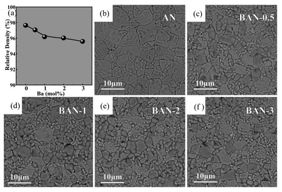 (a) The variation of relative density for the as-prepared Bax%Ag1-2x%NbO3(BAN-x) ceramics, SEM images of (b) AN, (c) BAN-0.5, (d) BAN-1, (e) BAN-2 and (f) BAN-3 ceramics. Reprinted with permission from [74]. Copyright 2018 Elsevier Ltd. and Techna Group S.r.l.