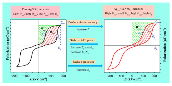 Luo et al. [75] obtained a Pmax of 39.6 μC·cm−2, an Eb of 220 kV·cm−1 and a Wrec of 3.55 J·cm−3 in Ag0.92Ca0.04NbO3 ceramics by conducting a solid-phase reaction at a temperature of 1350Compared with Ag+ (1.48 Å, CN = 12), Ca2+ (1.34 Å, CN = 12) possesses a much smaller ionic radius [3,76]. The substitution of Ag+ by bivalent Ca2+ cations created silver vacancies and enhanced polarization, stabilized AFE phase, increased EF and EA, decreased EF-EA, and reduced grain size to increase Eb (Figure 13).