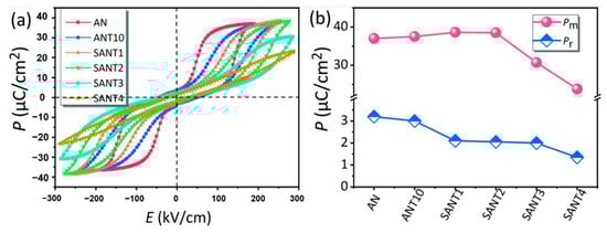 The polarization curve of antiferroelectric ceramics is an obvious “double hysteresis loop”, as shown in Figure 6d. The polarization increases linearly with the increase of the applied electric field. The larger the electric field, the greater the phase change. The P–E curve shows the characteristics of ferroelectrics.