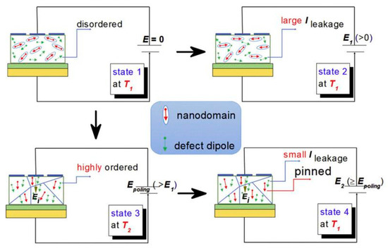 Ferroelectric materials with large breakdown electric fields can be widely used in many strong electric field applications, such as solid-state electrocaloric refrigeration, energy storage, electro strain, piezoelectric transduction, pyroelectricity, etc. Dielectric capacitors with the high power density and excellent temperature stability are highly demanded in pulsed power systems. A shown by formula (6), high breakdown electric field (Eb), high Pmax, and low Pr are preferred to achieve high energy storage density. To improve the dielectric breakdown strength of ferroelectric materials, the common strategies are: (1) reduce the sample thickness and electrode area [55,56]; (2) increase the density of the material [57]; (3) increase the width of the material forbidden band [58]; (4) increase the insulation of the material [59,60]; (5) implant dead layer [61,62]; (6) anneal in oxygen [63,64], and so on. Although these methods are very effective for systems that do not contain volatile elements such as BaTiO3, but for some systems rich in volatile elements, such as Bi, Pb, Na, K for example BiFeO3, PbZrO3, Na0.5K0.5NbO3, Na0.5Bi0.5TiO3, etc. These methods have limited effect. Therefore, Li et al. proposed a method to improve the dielectric breakdown strength and control the interaction between defect dipoles and nano domains by low-temperature-poling [65].