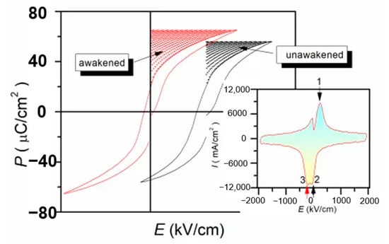 The disappearance of electric domains in a direction different from that of the electric field and the nucleation of electric domains in the same direction as the electric field causes hysteresis loop P(E) macroscopically (Figure 7). At point O, no electric field is applied to the ferroelectric body, the electric domains inside the ferroelectric body are disordered and randomly distributed and they do not show polarization externally. In the O-A segment, as the electric field increases, the polarization increases slowly because the domain wall movement between the electric domains only occurs due to the small electric field. In the A-B segment, as the electric field continues to increase, the polarization increases rapidly, at this time new domains begin to form and the domains in parallel or near-parallel electric field direction gradually increase and replace the other-oriented domains. In the B-C segment, the polarization reaches the maximum value. At this time, most of the electric domains of the ferroelectric are parallel or close to the parallel electric field direction and the inversion of the electric domains tends to saturate. Point C is called the maximum polarization (Pmax). In the C-D segment, as the electric field decreases, the polarization begins to decrease. When the electric field intensity is zero the intersection point D of the hysteresis loop and the vertical axis is called the residual polarization (Pr). When it reaches point F, the polarization at this time is zero, which is called the coercive field intensity (Ec). The ferroelectric will form a saturated hysteresis loop after cycling between the maximum value of the positive and negative electric fields and the energy required to reverse the domain twice is the same as the area surrounded by the hysteresis loop [23].