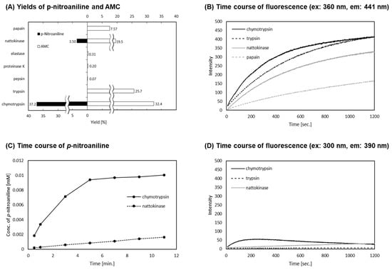 Proteases are enzymes that catalyze the hydrolysis of peptide bonds in proteins and are implemented in the development of many pathological conditions [1,2,3]. Methods for protease assays include liquid chromatography, electrochemistry, mass spectrometry, and fluorescence [4,5,6,7,8,9]. A fluorescence assay is one of the most popular among them due to its rapid responsibility and high sensitivity [4]. As for a fluorescence assay, “turn-on” molecular probes are generally utilized. The fluorescence of fluorophores in these molecular probes is initially quenched (“off” state), and the fluorescence turns on when the probes are reacted with serine proteases (“on” state). FRET [4] and the amide-bond formations between the nitrogen atom of fluorophores such as 7-amino-4-methylcoumarin (AMC) and the carboxy group of amino acid residue [5] have been utilized to achieve the “off” state. Being similar to fluorescent molecular probes, chromogenic molecular probes, which sometimes use p-nitroaniline as a chromogenic substrate, have also been reported [10,11,12,13,14,15,16,17]. In general, to detect the enzyme selectively, amino acid residues or peptides have been used. For example, phenylalanine was used as an amino acid moiety in the “turn-on” probe to detect α-chymotrypsin, which is known to cleave the amide (or peptide) bond at the C-terminus of tyrosine, tryptophan, and phenylalanine selectively [7,10]. Moreover, lysin was utilized in a peptide FRET probe to detect trypsin activity [15,16]. These designed molecular probes could measure the target enzymatic activities; however, untargeted enzymes sometimes reacted with the molecular probe due to their poor substrate selectivity [18]. In this work, we focused on such unexpected enzymatic activity in the reaction of proteases with the “turn on” fluorescence and/or chromogenic molecular probes.