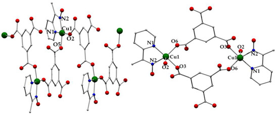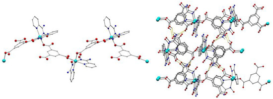4 crystallized in the orthorhombic space group Pna21; it is a zig-zag chain (Figure 5, left), formed by the connection of the [Cu(Hbtc)(Hmpko)] repeating units through the η1: η1:μ Hbtc2− ligands. The coordination sphere of CuII was completed by one neutral N,N’-bidentate chelating Hmpko ligand. CuII was the tetra-coordinate with a square planar geometry (N1-Cu1-O2 = 173.56°). A strong intramolecular hydrogen bonding interaction was formed between the neutral oximic group (O1, donor) and a carboxylate group (O3, acceptor) from the Hbtc2− ligand (O1···O3 = 2.516 Å, H1O1···O3 = 1.7 Å, O1-H1O1···O3 = 173.11°).